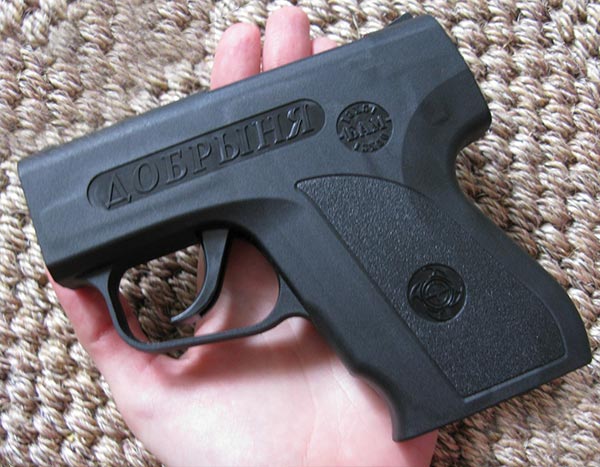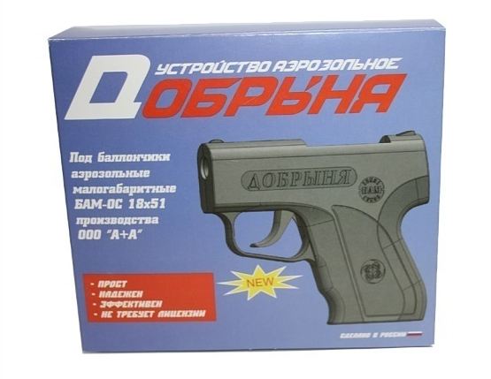 В наличии пистолеты Добрыня всегда самой свежей версии Аэрозольный пистолет самообороны «Добрыня» заметно отличается в лучшую сторону от большинства своих аналогов, выделяясь более эстетичным внешним видом и дизайном. Естественно, дизайн в оружии самообороны играет второстепенное значение, но некое сходство с боевым оружием может принести и свои плюсы, к примеру, дополнительный психологический эффект, который будет действовать на нападающего на вас человека. Данная модель нелетального оружия заряжается сверху пятью БАМами, они вставляются в расположенный в рукоятке встроенный магазин. После отстрела выброс гильзы происходит автоматически, при этом их можно извлечь, не стреляя из устройства, просто нажав на специальную клавишу, расположенную в казенной части. Стандартными для устройства являются баллончики БАМ-ОС.000 18х51 мм, которые также выпускаются в Туле на предприятии «А+А». Каждый такой БАМ снаряжен 4 кубическими сантиметрами вещества под названием олеорезин капсикум (экстракт красного перца). При выстреле на дистанции в 5 метров подобный БАМ образует пятно размером 300 на 400 мм. Используя специальные, входящие в комплект поставки устройства переходники, «Добрыню» можно научить стрелять и БАМами меньшего калибра 13х50 мм. Конечно, они будут обладать меньшей мощностью, но и стоят они несколько дешевле, кроме того, с их помощью можно также тренироваться в стрельбе из оружия, так как только в этом калибре производятся тренировочные БАМы, которые снаряжаются обыкновенной водой. Бикалиберность устройства позволяет также использовать вместе с ним БАМы с разными ирритантами и шумовые. Аэрозольное устройство Добрыня можно купить свободно с 18 лет, без разрешения на приобретение и ношение. Купить аэрозольный пистолет Добрыня у нас по низкой цене - отличное решение для самообороны Комплектация: пистолет аэрозольный Добрыня, паспорт, переходник для БАМ 13х50 - 5 шт