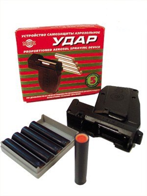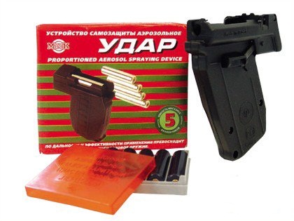 "УДАР" (Устройство Дозированного Аэрозольного Распыления) является средством самообороны, которое можно приобрести свободно без лицензии. Внешне напоминающее пистолетную рукоятку, это устройство стреляет патронами, снаряженными растворами ирритантов. Патроны к УДАРу называются БАМами (БАМ - Баллон Аэрозольный Малогабаритный). БАМ представляет собой патрон калибра 13 мм, в металлической или пластмассовой гильзе которого размещается традиционный капсюль. При нажатии на спусковой крючок, капсюль воспламеняется и приводит в движение поршень, который и выбрасывает наружу раствор ирританта. Выпускаются БАМы различных видов: тренировочные (не содержащие каких-либо, раздражающх слизистую, веществ); с ирритантами CN, CS, OC, МПК; снаряженные ирритантом CR (CR - дибенз [в,f][1,4] оксазепин - высокоэффективный ирритант, обладающий сильным раздражающим действием на глаза, носоглотку и кожу. При контакте аэрозоля со слизистыми оболочками глаз возникают обильное слезотечение, резь в глазах; возможна временная потеря зрения. Вдыхание аэрозоля вызывает сильный кашель, чихание и насморк); еще выпускаются БАМы светошумового действия, а также комбинированные, содержащие смесь МПК и краски. В БАМах хорошо то, что они содержат в себе ирританты в достаточно высоких концентрациях. Комплектация: устройство Удар, коробка, паспорт Основные преимущества УДАРа: