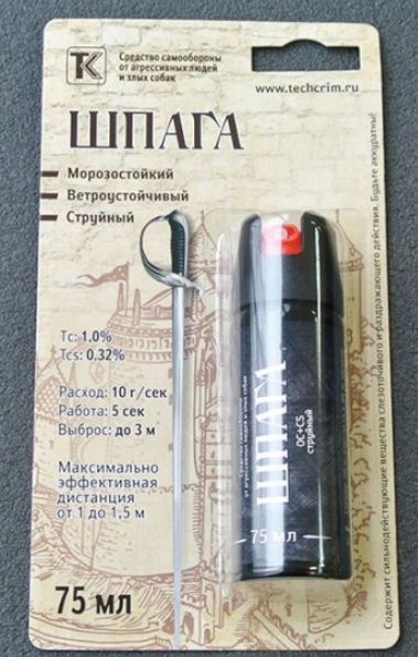 Баллончики Шпага бывают с обычной крышкой (открытая кнопка нажатия) и с защитной крышкой, которая спасет от случайного нажатия в кармане или сумке (именно этот вариант баллона Шпага мы рекомендуем купить) Новый СТРУЙНЫЙ перцовый баллончик Шпага от ЗАО "Техкрим" в универсальном объеме 75 мл, вышедший взамен моделям Шпага 65 и 100 мл. Состав и дальность распыления остались прежними: ОС (экстракт перца) 489 мг (1%) + вещество CS - 150 мг (0,32%), до 3-х метров. Баллончик Шпага 75 мл обладает морозостойкостью до -20 оС, что является отличным выбором в холодное время года. Расход составляет 10 г/сек с временем выхода содержимого 5 секунд. Как и предыдущие распылители серии Шпага, он имеет хорошую ветроустойчивость (до 6 м/с) и обладает возможностью применения в помещениях. Купить перцовый баллончик Шпага 75 мл лучше всего со свежим сроком годности, в этом Вам поможет наш магазин Слезоточивые вещества (ирританты):