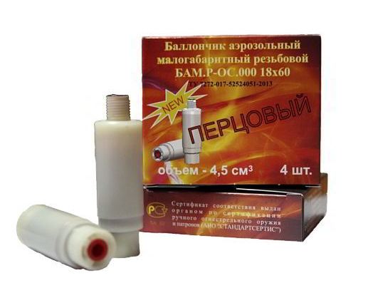 БАМ.Р-ОС 18x60, перцовый: Баллончики аэрозольные малогабаритные резьбовые перцовые 18x60 (БАМ.Р-ОС) предназначены для использования с помощью пусковых устройств "Сигнал охотника", что существенно расширяет и удешевляет возможность их применения гражданами. БАМ.Р-ОС 18х60 может использоваться также и с аэрозольными устройствами "Чародей". Цена указана за упаковку. Производитель ООО "А+А" Тула Для Екатеринбурга: