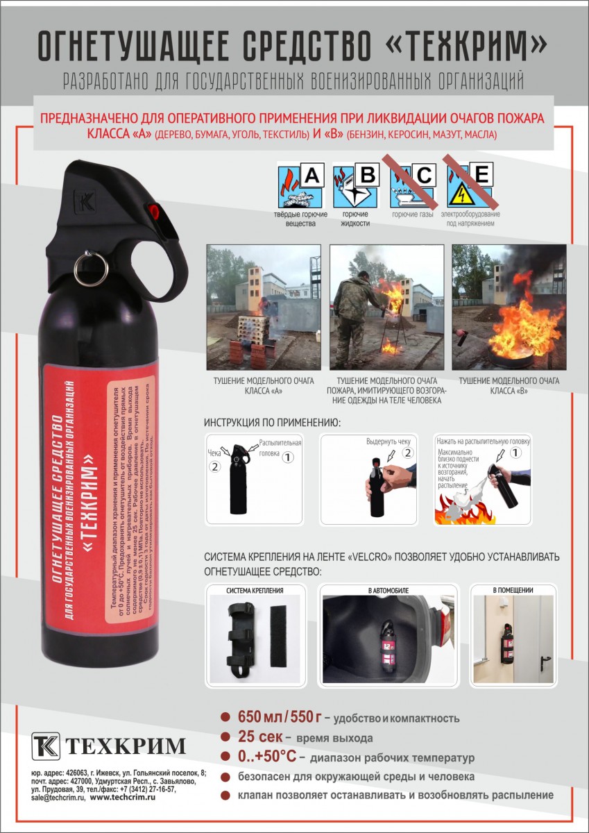 Огнетушащее средство «Техкрим» 650мл (компактный огнетушитель) ПРИЧИНА УЦЕНКИ: вышел срок годности. производство 16.09.2020 (срок годности указан 3 года) Предназначено для оперативного применения при ликвидации очагов пожара класса «А» (дерево, бумага, уголь, текстиль) и «В» (бензин, керосин, мазут, масла).
