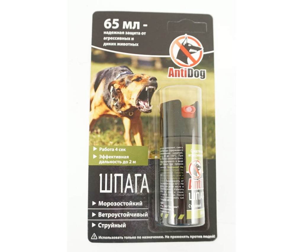 Распылитель (аэрозольный баллончик) от собак AntiDog Шпага, 65 мл – это высокоэффективное средство от нападения собак, новая разработка российской компании «Техкрим». Продукт использует струйный тип распыления, и за счет невысокого респираторного эффекта подходит также для использования в помещениях. При нажатии на кнопку распылителя из него вырывается мощная струя специальной смеси, вызывающая крапивный эффект. За счет высокой эффективной дальности распыления (до 2,5 метров) он подходит для использования на средних дистанциях, позволяя не подпустить животное близко. В составе распылителя: смесь отпугивающих экстрактов, репелленты и растворители. За счет отсутствия в смеси распылителя простых ирритантов его действие не делает животное непредсказуемым. Объема одного баллончика достаточно для шести кратковременных нажатий. Действие состава распылителя предназначено исключительно для предотвращения агрессии бродячих животных, при этом не наносит им значительного вреда. Антидог Шпага – индивидуальное средство защиты от агрессии бродячих собак, позволяющее избежать нападения и укусов и детям, пожилым людям, и взрослым. Для Екатеринбурга: