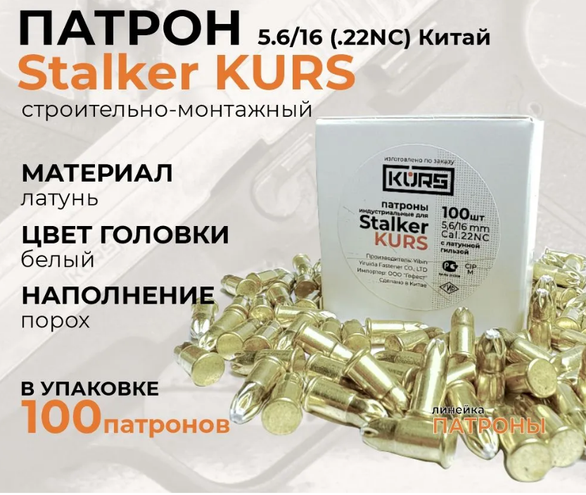 Патроны для Stalker KURS (Stalker 906) 5.6/16 (.22NC) 100шт Качественный заменитель Хилти по доступной цене. Специально разработаны для сигнального Stalker KURS на фоне дефицита и высокой цены Хилти! Патроны протестированы на Stalker KURS - работают отлично! Гильза - латунь ! НЕ ПОДХОДЯТ для Бульдог КУРС! Гильза в барабане раздувается там где не надо - и плохо экстрактируется из барабана Для Екатеринбурга: