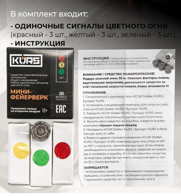 Минифейерверки KURS (сигнальные ракеты для STALKER и Бульдог KURS) и для других сигнальных пистолетов - МР-371, Bond 007, LOM-S и тд В наличии минифейерверки нового образца (в черной коробке) Ракеты подходят: для пистолетов, которые работают на капсюлях - Макаров МР-371 и др (нужно приобрести мортирку для запуска) для пистолетов, которые работают на монтажных патронах 5,6х16 - Бульдог, STALKER, LOM-S и др (мортирка обычно идет с ними в комплекте) Ракета взлетает на высоту 20-30м, светясь ярким цветом. Упаковка 9шт (красный, желтый и зеленый по 3шт). Производство Россия Для Екатеринбурга:
