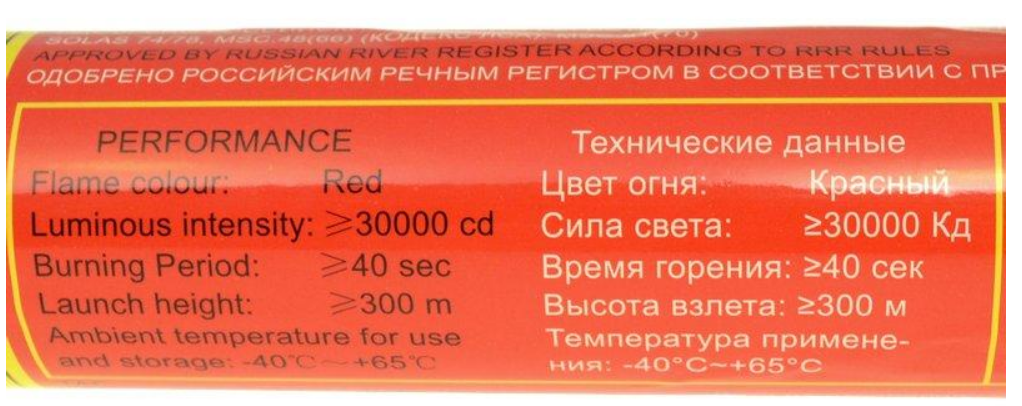 Ракета ПРБ-40 – это парашютная ракета бедствия, которая используется для того, чтобы сигнализировать о бедствии и предупреждать в случае опасности. Ракета ПРБ-40 соответствует всем требованиям МК СОЛАС-74. Ракета ПРБ-40 широко используется на морских судах, а также популярна в походах в горы. В наличии ПРБ двух видов (выбрать можно в окошке, справа от цены) 1) ПРБ-40 от ФГУП Сигнал, г Челябинск 2) ПРБ-40 HGS40-30000, ZHENHUA (Китай) Состав ракеты ПРБ-40Ракета состоит из двух деталей: пластмассовой гильзы, которая выполняет роль пусковой трубки, и самой ракеты. Во втулке находится терочный капсюль-воспламенитель. Ракета состоит из двигателя, кольца, обтекателя и сигнальной части, где в свою очередь находится сигнальный факел с парашютом. Принцип действия ракеты ПРБ-40 После, того, как вытяжной шнур выдернут, капсюль-воспламенитель воспламеняет звездку в реактивной части ракеты. Затем воспламеняется шашка пороха, что вызывает вылет ракеты из гильзы. Загорается звездка, а за ней факел красного цвета, который выбрасывается из ракеты с парашютом. Световой сигнал длится 30 и более секунд, мощность сияния – до 40 тысяч свечей. Сигнал этой ракеты заметен на расстоянии не менее 25-30 километров ночью и несколько километров днем. Технические характеристики ПРБ-40 (ФГУП Сигнал)