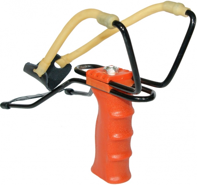 Рогатка "MB" большая с упором и регулировочной ручкой - средство, предназначенное для использования в развлекательных и спортивных целях. Рукоятка рогатки сделана из пластика, что облегчает вес изделия, оборудована упором для запястья, которая фиксирует инструмент при стрельбе, делает его неподвижным. Пластиковая рогатка имеет рельефную поверхность, что позволяет крепко держать изделие в руках в любом положении. Регулировка упора позволяет использовать рогатку людям с разной комплекцией и даже детям, но только в присутствии взрослых. С целью увеличения срока службы каучукового жгута рогатки, стальной рогачек изделия согнут под углом 90 градусов в сторону направления резинки. Жгут такого изделия, как рогатка МВ большая с упором и регулировочной ручкой, имеет круглое сечение, полый внутри и изготавливается из прочной резины с добавлением натурального каучука. Седло рогатки изготовлено из кожи. Для стрельбы из рогатки MB большой с упором лучше всего использовать стальные шарики для рогаток калибра 8 мм.