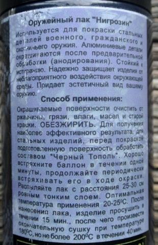 Главная → Купить по низкой цене → Средства по уходу → Средства для воронения → Лак оружейный НИГРОЗИН (100 мл)
