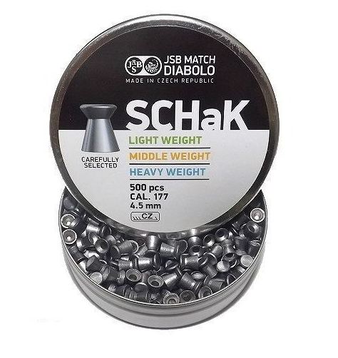 Пули JSB Diabolo SCHaK Light калибра 4,5 мм - плоскоголовые пули для пневматических винтовок и пистолетов. В основном эти пули покупают для спортивной стрельбы. Мягкие свинцовые пули высокого качества. Пули имеют плоскую головку, и при попадании в цель получается четкое отверстие. Характеристики