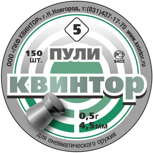 Пули пневм. "Квинтор" (300 шт) плоская головка. Одна из разновидностей пуль «Квинтор» - матчевая пуля с плоской головной частью. Она подходит для пневматического оружия различной мощности. Благодаря такому классическому строению (пуля типа «диаболо») в бумажных мишенях остаются пробоины с ровными краями, что существенно упрощает подсчет набранных баллов. Пуля имеет неплохие показатели скорости, кучности и хорошую точность попадания в цель. Эти пули производят из качественного свинца. Данный вид пуль «Квинтор» используется, как правило, на соревнованиях.