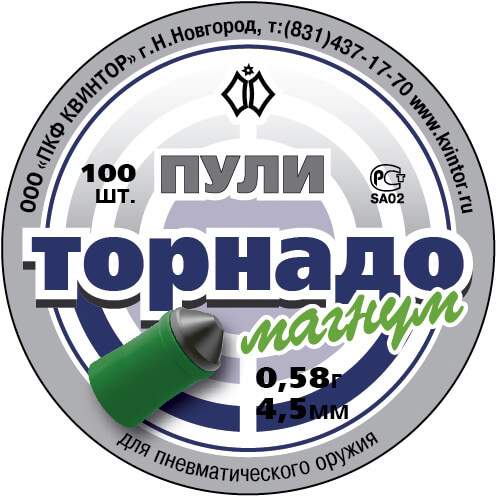 Главная → Купить по низкой цене → Пули и шары 4.5 / 6 мм → Квинтор (Россия) → Пули пневм. Квинтор "Торнадо-Магнум", 0.58 г (100 шт)