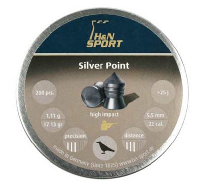 Вес в гранах 17.13 Пули H&N Silver Point 5.5 мм - тяжелая, точная охотничья пуля для средних дистанций. Высокая пробиваемость и проникающая способность с наивысшим шоковым воздействием. Поверхность гладкая, с канавками.