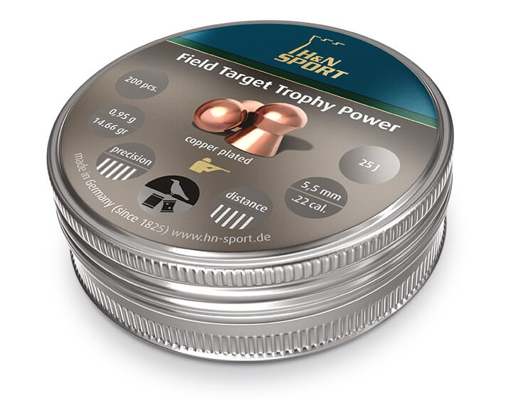 Пули пневм. H&N Field Target Trophy Power 5.5 мм, 0.95г (200шт) на 20 % тверже, чем сравнимые свинцовые пули. Средняя по тяжести, высокоточная пуля с настильной траекторией полета и для дальних дистанций. Ствол не освинцовывается, улучшенное про- хождение по каналу ствола, отсутствие контакта со свинцом благодаря специальному медному покрытию (на 20 % тверже, чем сравнимые свинцовые пули). Необычный аэродинамический дизайн для высокой про- биваемости и улучшенной проникающей способности. Очень высокая кучность. Поверхность гладкая. Характеристики