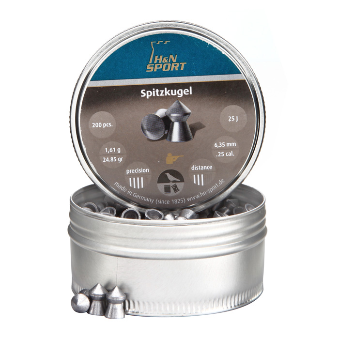 Пули пневм. H&N Spitzkugel 6.35 мм, 1.65г (200шт). Аэродинамический дизайн для настильной траектории полета. Средняя по тяжести, очень точная, остроконечная пуля для охоты и прецизионной стрельбы для средних дистанций. Аэродинамический дизайн для настильной траектории полета и высокой пробиваемости. Поверхность гладкая. Характеристики